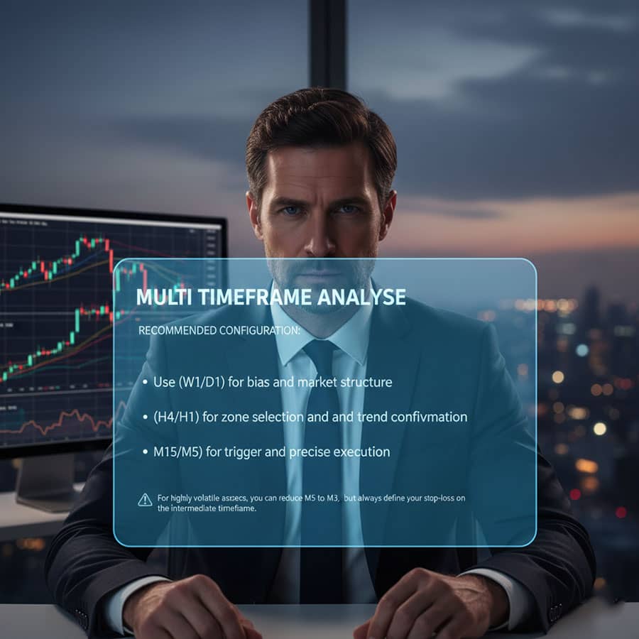 پیکربندی پیشنهادی: (W1/D1) برای بایاس و ساختار؛ (H4/H1) برای ناحیهگزینی و تأیید روند؛ (M15/M5) برای تریگر و اجرای دقیق. در داراییهای پرنوسان میتوانید M5 را به M3 کاهش دهید، اما حد ضرر را در TF میانی تعریف کنید.