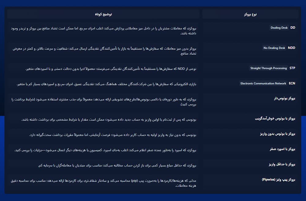 معایب: احتمال تضاد منافع بین بروکر و معاملهگر، شفافیت کمتر نسبت به سایر مدلها.